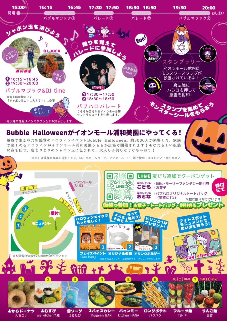 募集要項 Bubble Halloween2025日時:2025年10月18日(土)・19日(日)15:00〜20:00場所:イオンモール浦和美園 うららか広場(屋外) 募集人数 ⚫︎インフォメーションスタ…
