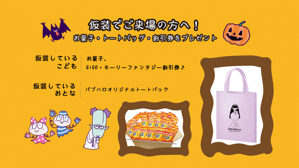 仮装してご来場予定の皆さま!ぜひ LINE登録をお願いいたします!Bubble Halloweenで仮装してくれた方に、プレゼントします! ・仮装しているお子さま:お菓子、GiGO・モーリーファンタジー割引券♪※ママやパパが登録してくださった場合、お子さまの人数分... -